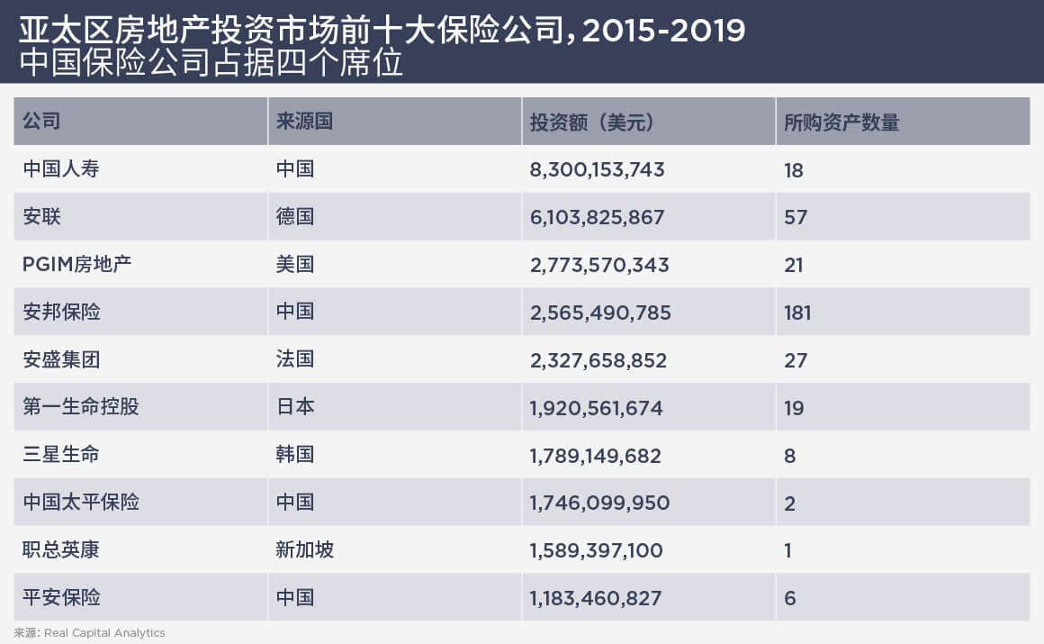 亚洲最活跃的保险公司中不乏中国境内公司的身影(见下表),但目前仅限于在境内投资。韩国保险公司已在海外布局,而在本地房地产市场上占主导地位的台湾保险公司却因为苛刻的监管环境而难以推进。Young表示:“保险公司受到严格监管,了解其监管限制是与之打交道的关键。此外,亚洲市场的租期较短,也可能成为保险公司投资房地产的障碍。”